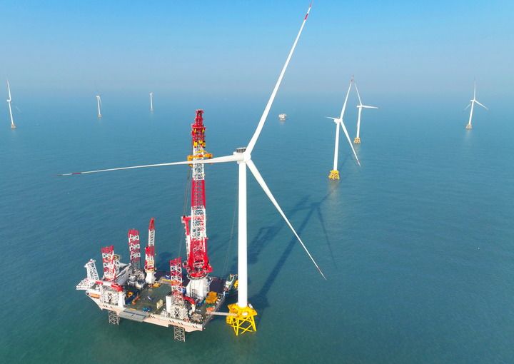 2026年1月13日在福建闽南海域拍摄的“大桥海风”号2000吨自升式海上风电安装平台和20兆瓦风电机组吊装现场(无人机照片)。新华社记者 林善传 摄