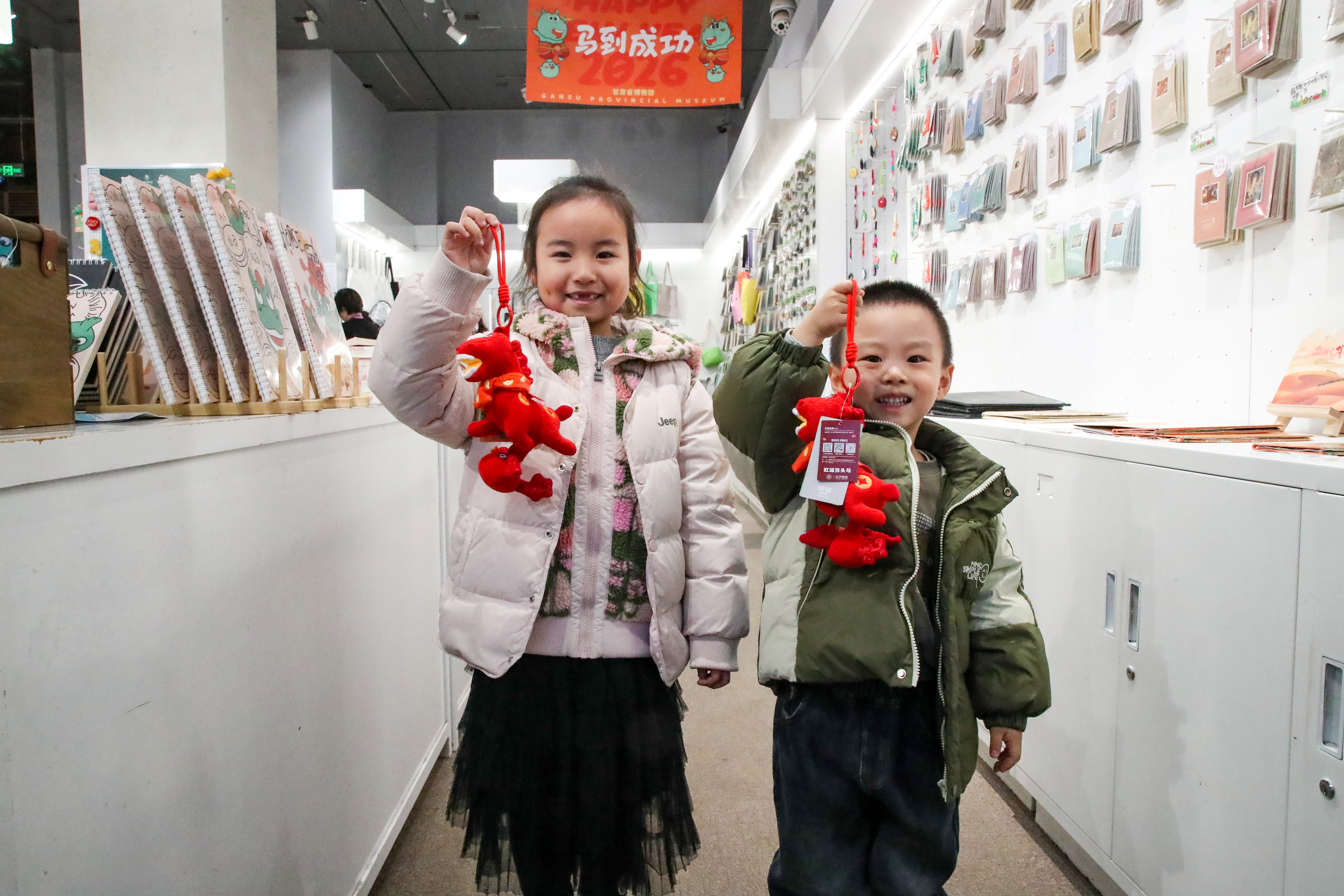 2026年1月26日晚,在甘肃省博物馆文创商店,小朋友展示刚购买的新款马踏飞燕贺岁毛绒玩偶“红运当头马”。新华社记者 郎兵兵 摄
