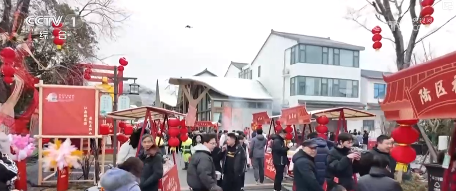 在江苏无锡的阳山镇,红彤彤、暖烘烘的年味市集吸引十里八乡的人纷至沓来。年的味道,不仅飘在空气里,更握在手中,藏在软糯香甜的糕团里。集市上,各色美食唤醒人们童年记忆,非遗技艺展示也吸引众多目光。