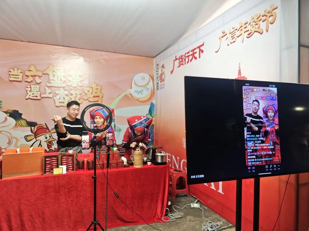 市集上最引人注目的搭配之一,莫过于国家地理标志产品——封开杏花鸡与广西梧州六堡茶的联袂亮相。
