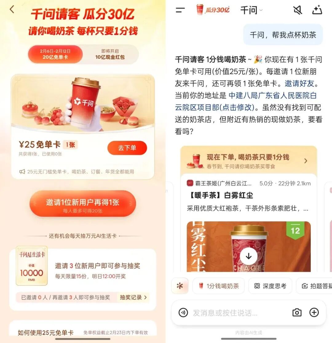 2月7日,阿里千问宣布,“25元免单卡”权益截止日延长至28日。其“春节30亿免单”攻势的第一枪,前一天已从奶茶开打。