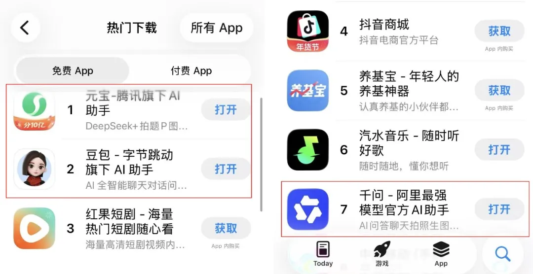 1月中旬,千问App月均活跃用户数,突破1亿,依旧难言领先。记者注意到,官宣“免单”计划的2月2日,苹果App Store免费榜前十,正发红包的元宝居首,豆包第二,千问只排到第七。