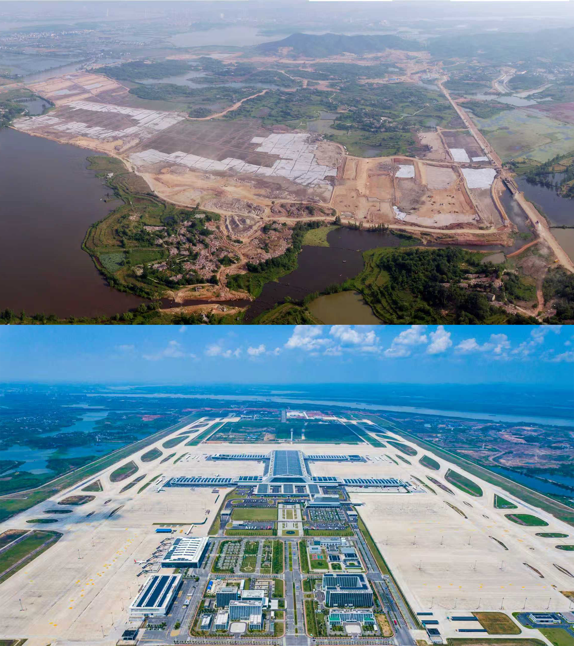 2019年还是一块工地的鄂州花湖国际机场,如今已成为通达世界的航空货运枢纽(央广网发 上图鄂州花湖国际机场供图;下图任勇 摄)