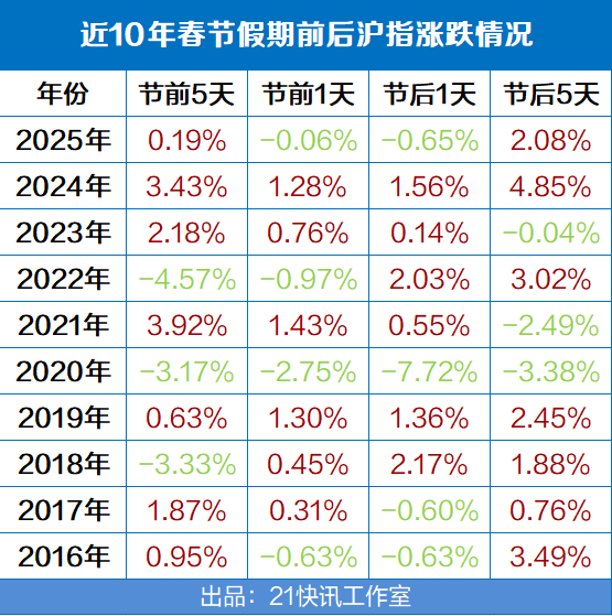 21快讯记者据同花顺iFind统计,近10年春节假期前后5个交易日,沪指均录得7年上涨,3年下跌。春节假期前后1个交易日,沪指均录得6年上涨,4年下跌。 整体来看,A股春节前后大概率上涨。