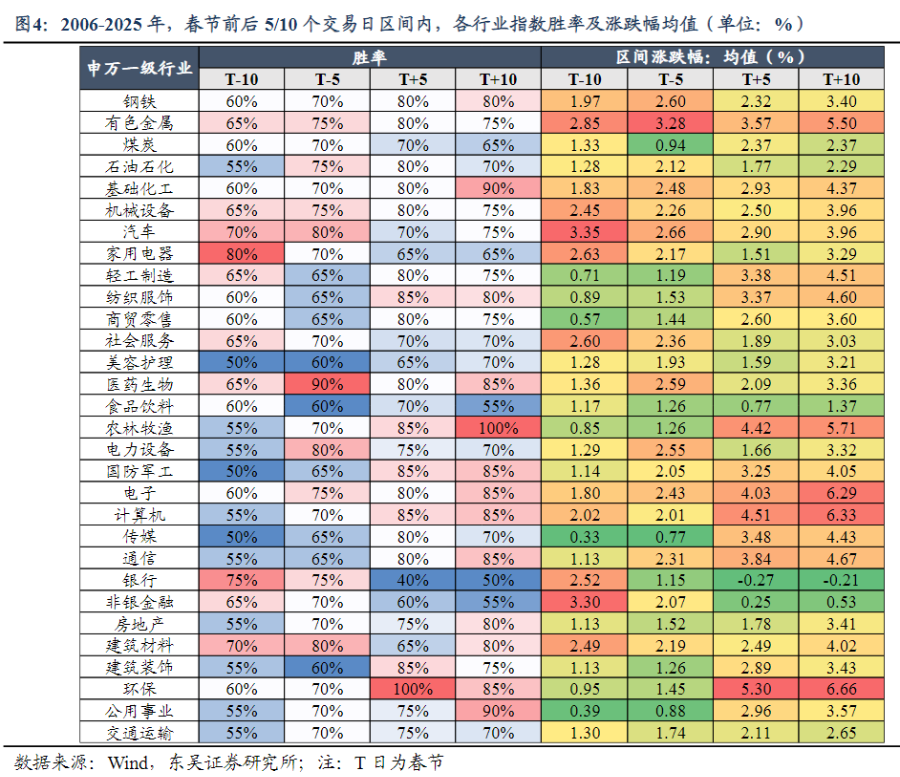 东吴证券复盘了近20年A股春节前后的市场表现,指出节前一周是指数布局的最佳窗口期,节前5日左右往往迎来反弹拐点。行业方面,节前历史表现占优的行业主要包括有色、汽车、化工、医药、电力设备等,节后表现相对突出的是环保、电子、传媒、农林牧渔等。