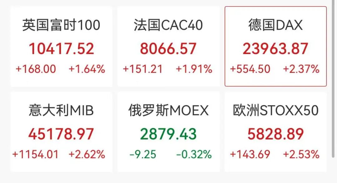 3月10日,欧洲主要股市开盘全线走高,截至17点,德国DAX30指数涨2.37%,英国富时100指数涨1.63%,法国CAC40指数涨1.91%,欧洲斯托克50指数涨2.53%,西班牙IBEX35指数涨2.48%,意大利富时MIB指数涨2.62%。
