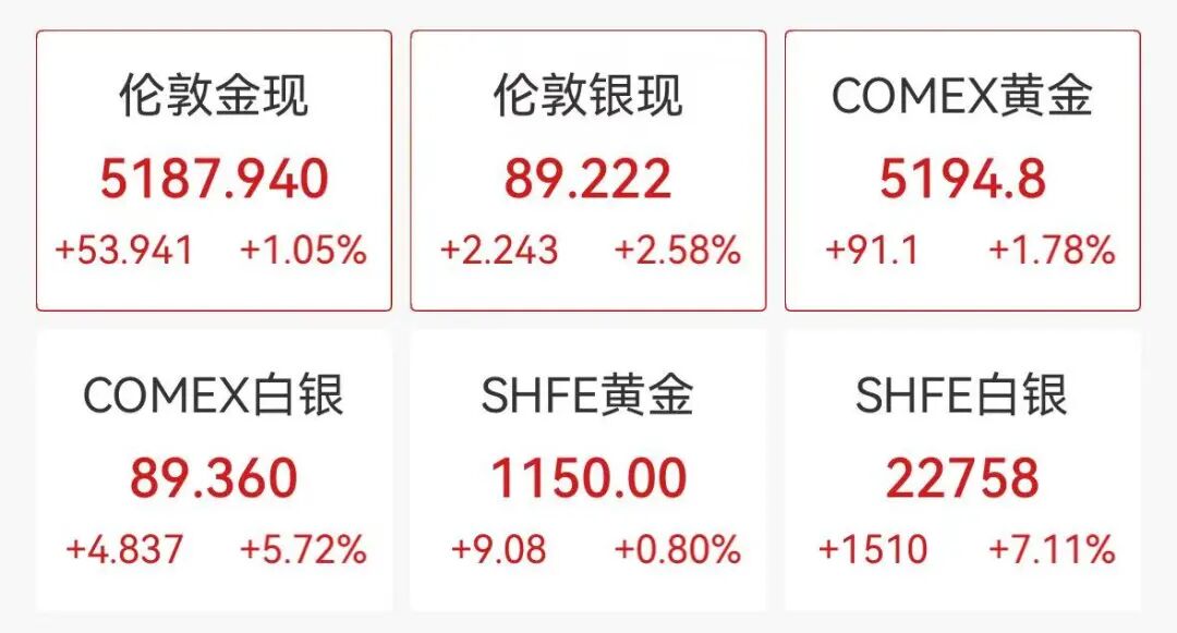 现货金银价格快速拉升,截至发稿,现货黄金价格涨超1%,报5187美元/盎司,现货白银报89.22美元/盎司,日内涨超2%。