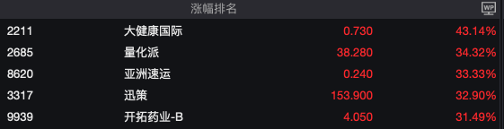 从个股表现来看,涨幅前三中,包大健康国际(2211.HK) 以43.14%的涨幅位居榜首;金融科技公司量化派(2685.HK)上涨34.32%。OpenClaw概念股迅策(3317.HK) 延续昨日强势,今日大涨32.90%。