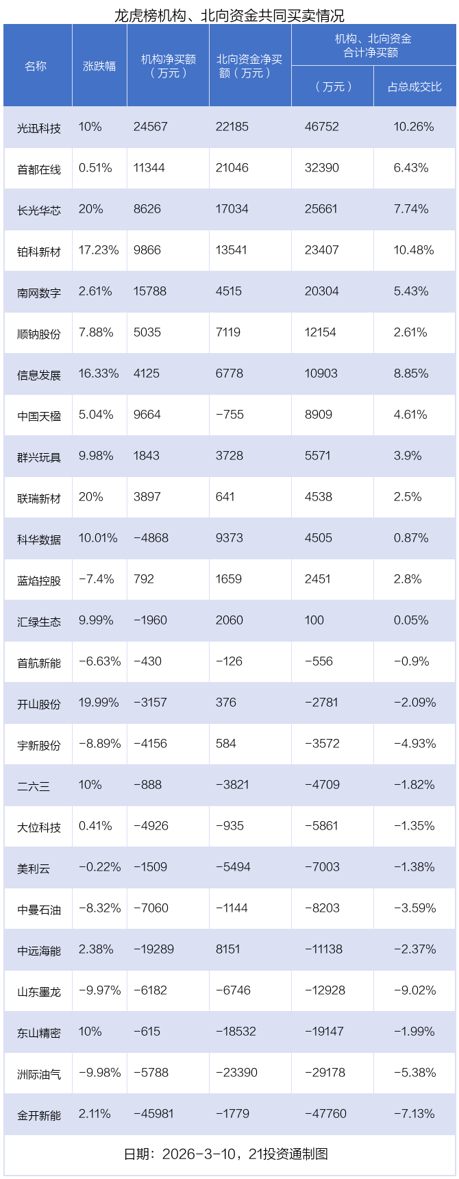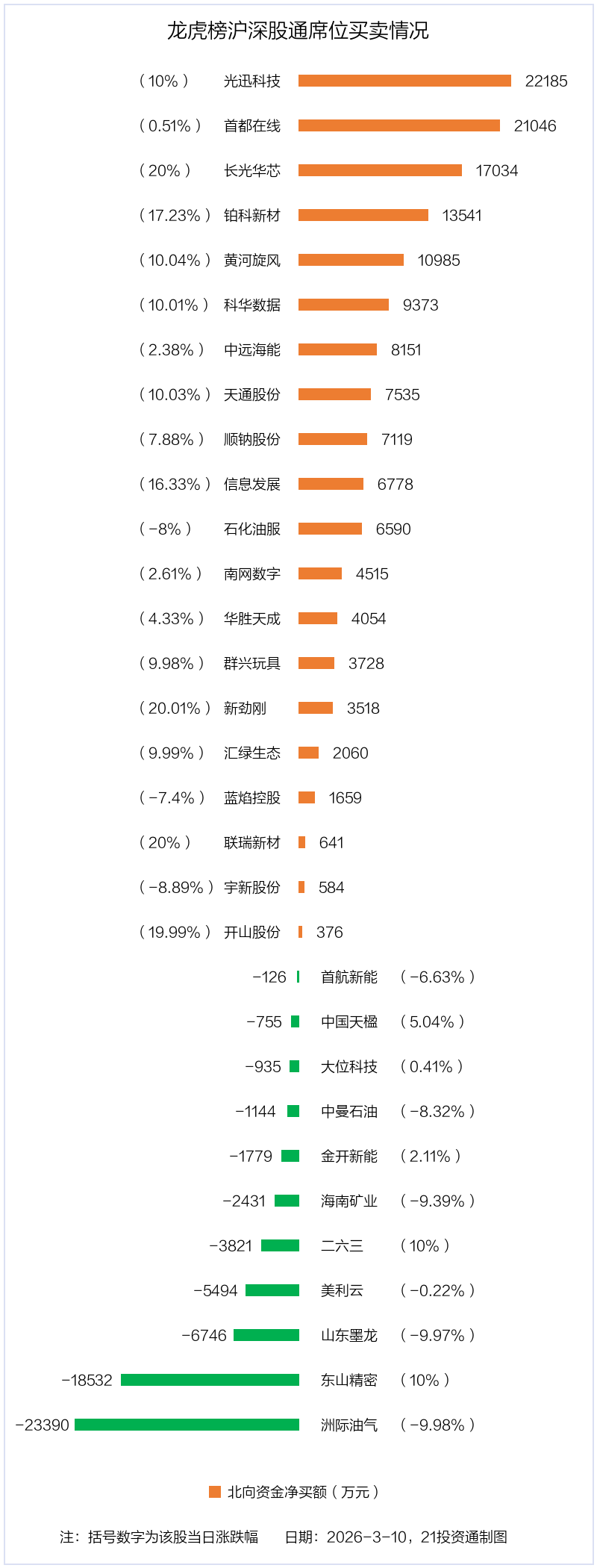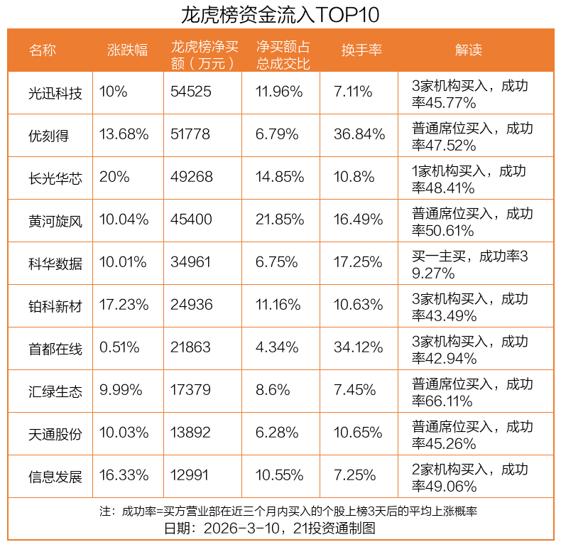 3月10日,上证指数上涨0.65%,深证成指上涨2.04%,创业板指上涨3.04%。盘后龙虎榜数据显示,共有54只个股因当日异动登上龙虎榜,资金净流入最多的是光迅科技(002281.SZ),达5.45亿元。