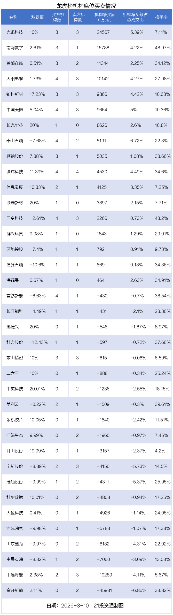 3月10日,37只个股龙虎榜出现了机构的身影,机构合计净买入3239.89万元。具体来看,机构净买入17股,净卖出20股。