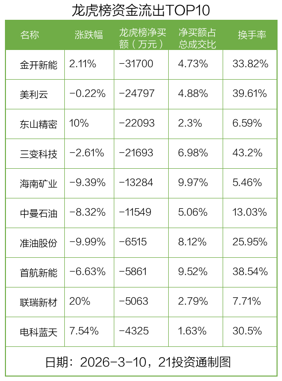 而龙虎榜中资金净流出最多的是金开新能(600821.SH),被净卖出为3.17亿元,占总成交金额的4.73%。金开新能收盘上涨2.11%,换手率为33.82%。