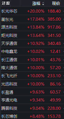 截至收盘,光纤概念大涨超5%,长光华芯“20cm”涨停,中电鑫龙、长江通信、烽火通信、长飞光纤、光迅科技涨停。