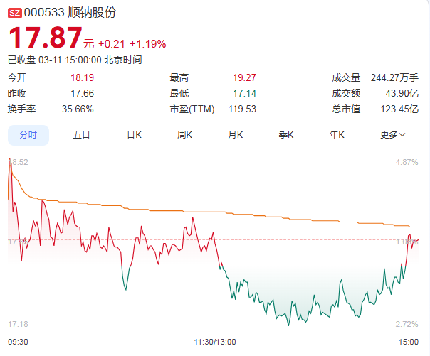 3月11日,顺钠股份股价上涨1.19%,收盘价为17.87元,成交额为43.90亿元,总市值攀升至123.45亿元。据统计,自2026年2月2日以来的22个交易日内,顺钠股份股价累计涨幅超过113%,表现非常亮眼。