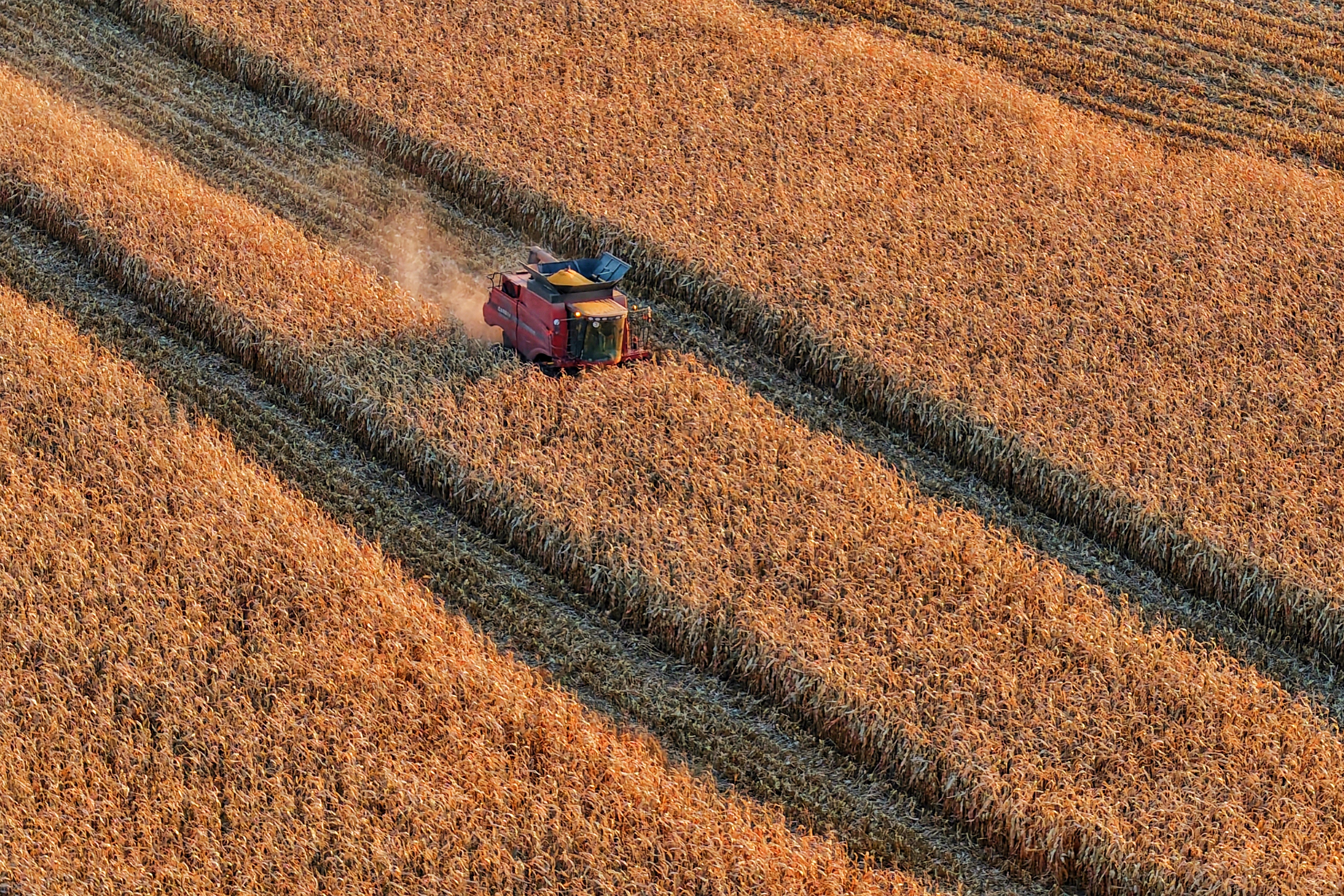 2025年10月14日,在黑龙江同江市街津口赫哲族乡,农户在收获玉米(无人机照片)。新华社发(刘万平摄)