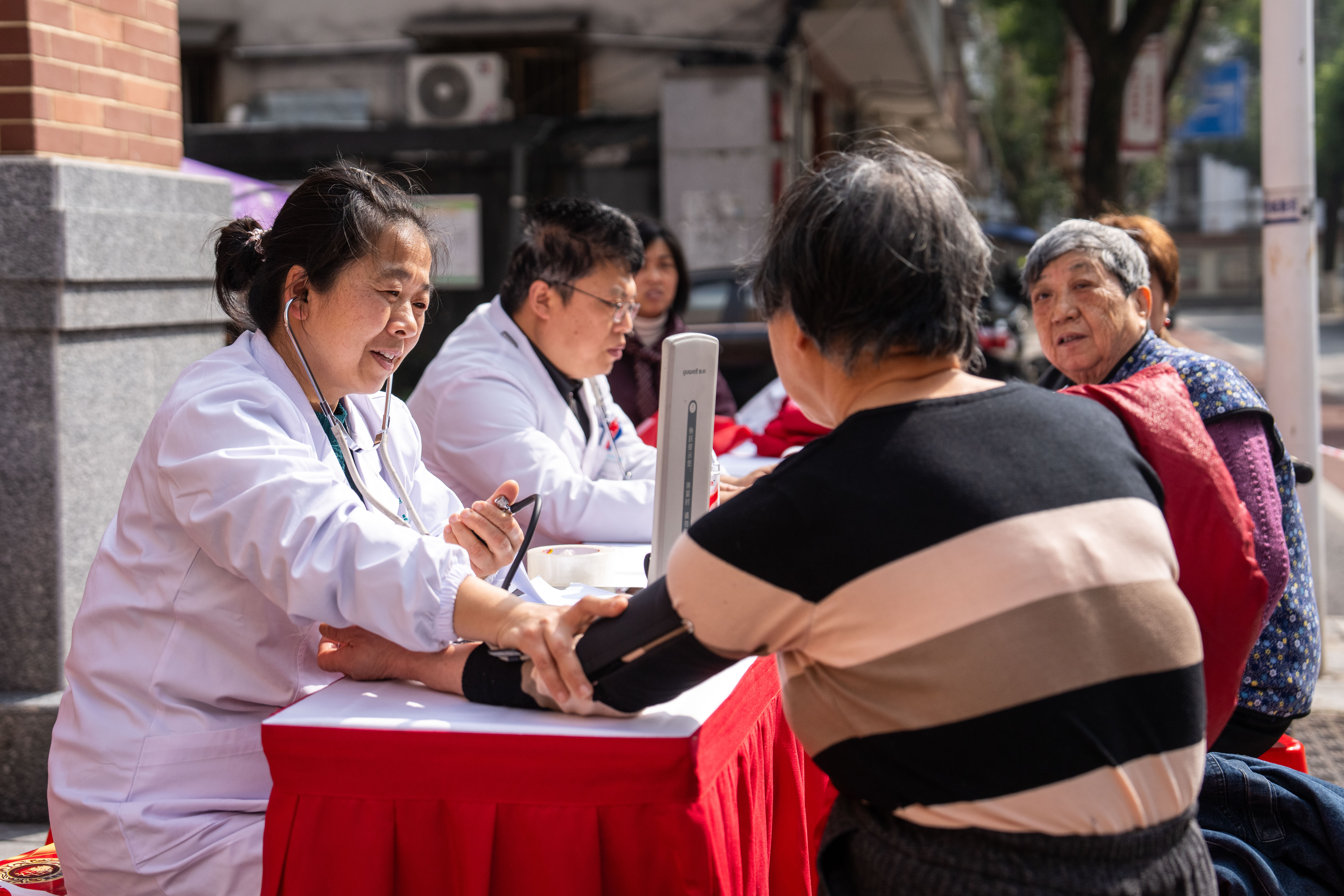 2026年3月5日,在湖南长沙市望城区高塘岭街道雷锋路社区雷锋驿站,志愿者(左一)为市民测量血压。新华社记者 陈思汗 摄