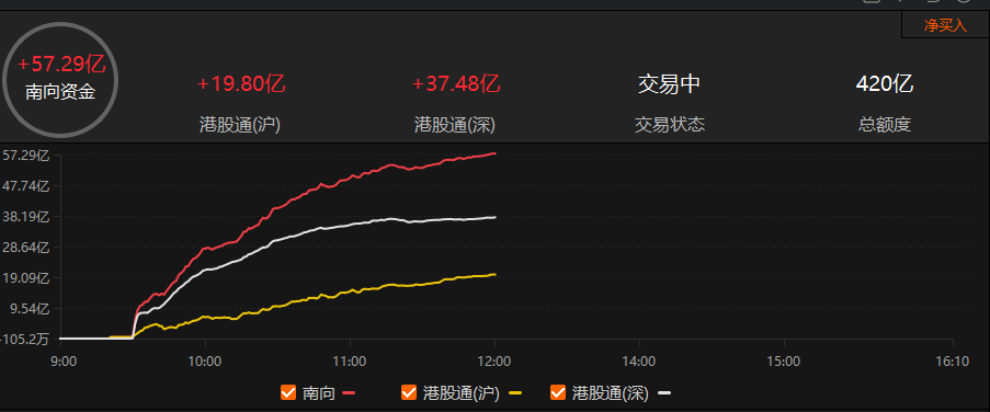 早盘南向资金净买入57.29亿元。