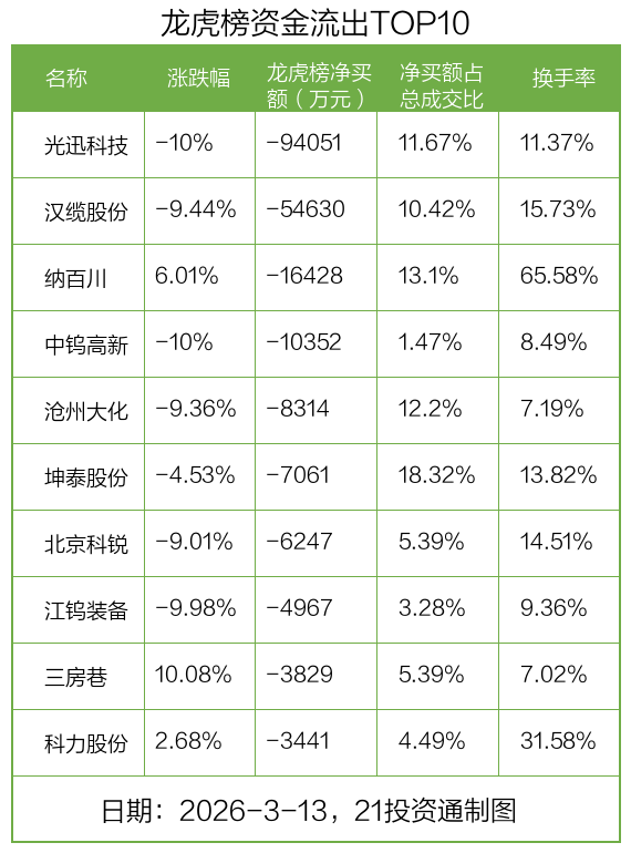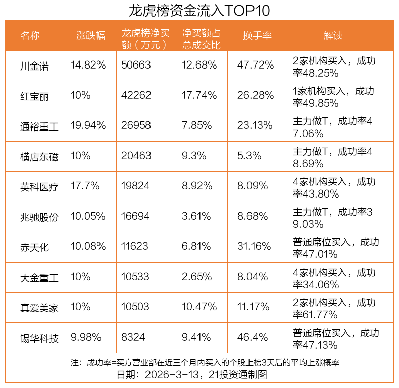 3月13日,上证指数下跌0.81%,深证成指下跌0.65%,创业板指下跌0.22%。盘后龙虎榜数据显示,共有46只个股因当日异动登上龙虎榜,资金净流入最多的是川金诺(300505.SZ),达5.07亿元。