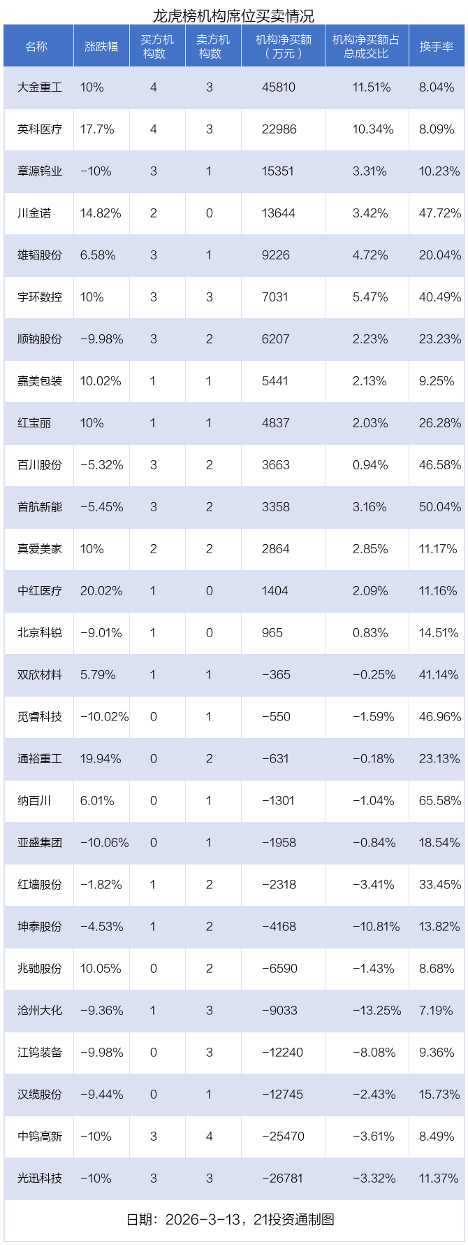 3月13日,27只个股龙虎榜出现了机构的身影,机构合计净买入3.86亿元。具体来看,机构净买入14股,净卖出13股。