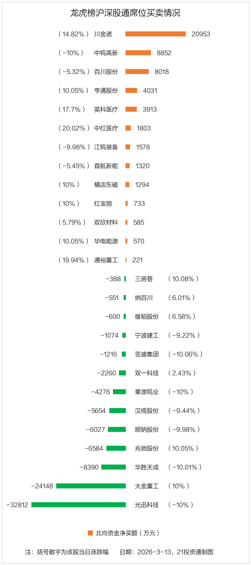3月13日,北向资金参与龙虎榜中的个股共有26只,合计净卖出4.01亿元。其中沪股通净买入3 股,净卖出4 股,合计净卖出4889.58万元;深股通净买入10 股,净卖出9 股,合计净卖出3.52亿元。