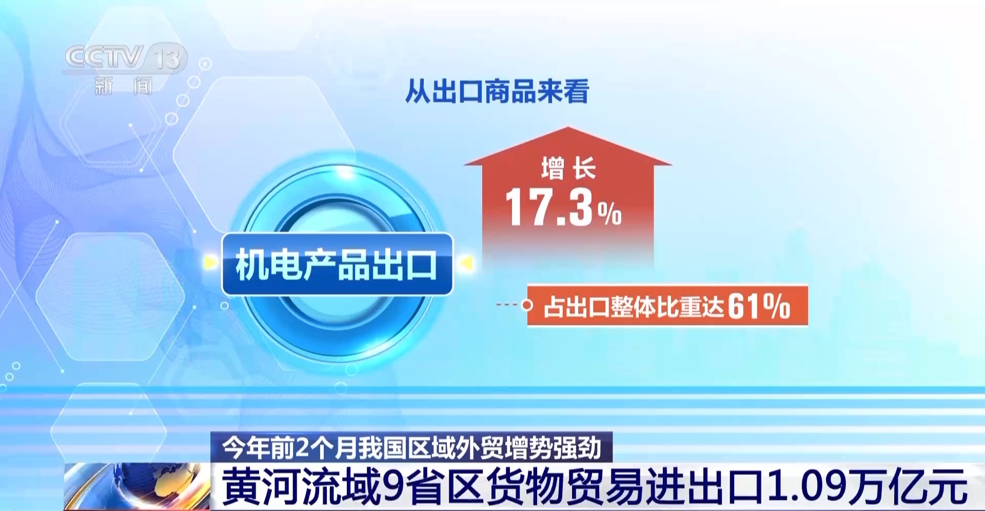 从出口商品来看,“新三样”、高新技术产品和农产品出口增长显著,特别是机电产品出口增长17.3%,占出口整体比重达61%。