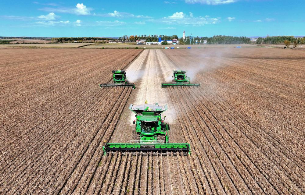 2025年9月29日,在北大荒集团黑龙江尾山农场有限公司第一管理区,农机进行大豆收获作业(无人机照片)。新华社发(陆文祥 摄)