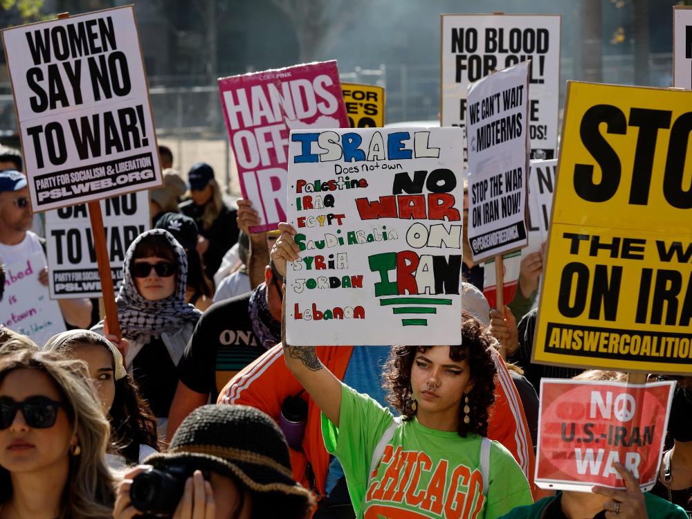 3月7日,在美国加利福尼亚州洛杉矶市政厅前,人们参加集会,抗议美国和以色列对伊朗发动军事打击。新华社发(邱晨摄)