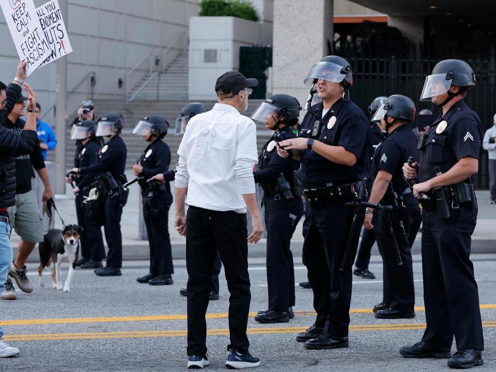 1月25日,在美国加利福尼亚州洛杉矶的大都会拘留中心附近,抗议者与警察对峙。新华社发