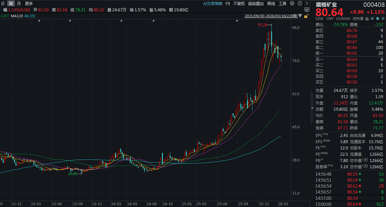而截至3月16日,藏格矿业最新价已经达到80.64元/股,紫金矿业上述股权增值幅度已经达到130.4%。