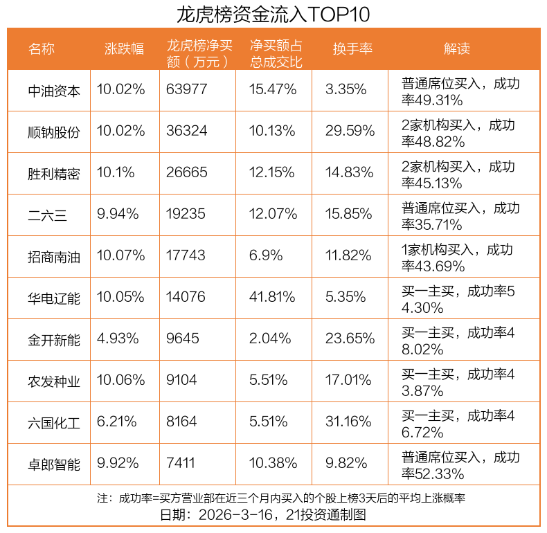 3月16日,上证指数下跌0.26%,深证成指上涨0.19%,创业板指上涨1.41%。盘后龙虎榜数据显示,共有49只个股因当日异动登上龙虎榜,资金净流入最多的是中油资本(000617.SZ),达6.4亿元。