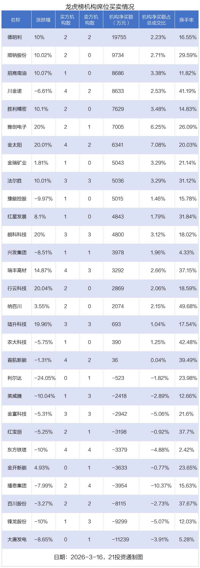 3月16日,29只个股龙虎榜出现了机构的身影,机构合计净买入5.72亿元。具体来看,机构净买入19股,净卖出10股。