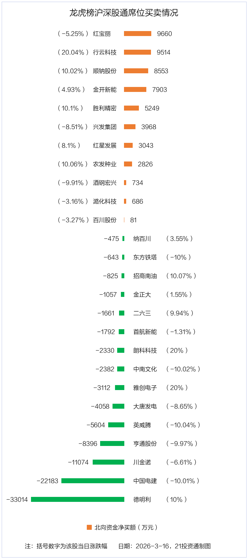 3月16日,北向资金参与龙虎榜中的个股共有26只,合计净卖出4.64亿元。其中沪股通净买入6 股,净卖出4 股,合计净卖出1.63亿元;深股通净买入5 股,净卖出11 股,合计净卖出3.01亿元。
