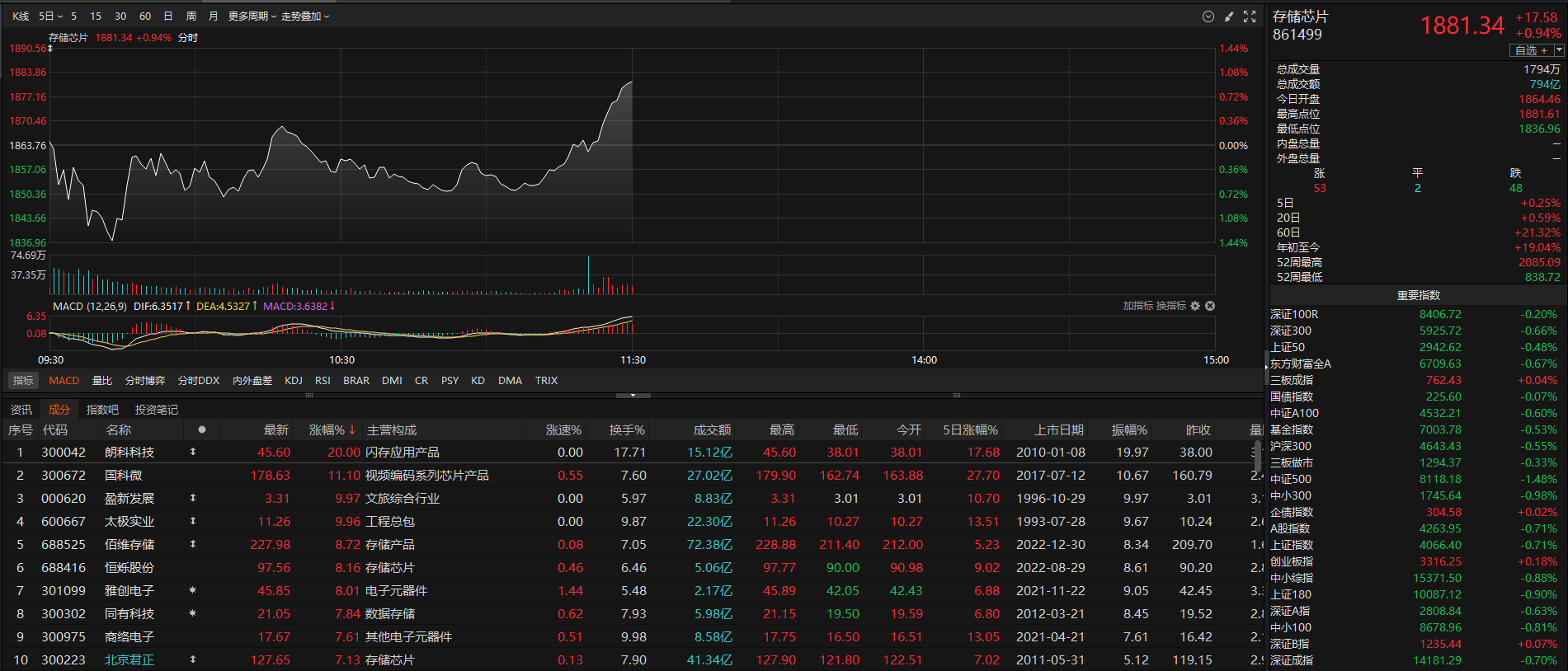 存储芯片概念早盘尾盘逆势拉升,截至午间休盘,朗新科技“20cm”涨停,国科微涨超10%,盈新发展、太极实业涨停,佰维存储涨超8%续创历史新高,此外,恒烁股份、雅创电子等跟涨。