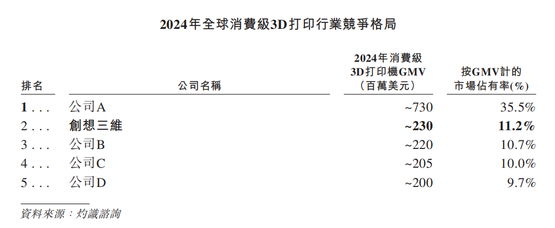 根据灼识咨询的数据,2024年,按GMV计,创想三维在全球消费级3D打印机市场和全球消费级3D扫描仪市场分别排名第二和第一,在全球消费级激光雕刻机市场也排名第三。