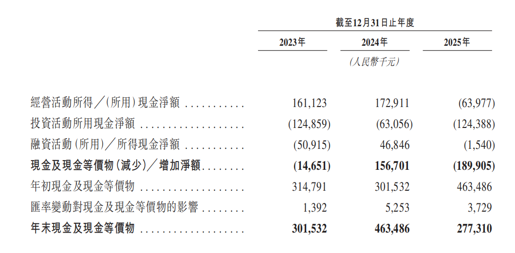 从现金流量表看,2025年,公司经营活动现金流净额自2023年以来首次转负,录得-6397.7万元。从招股书看,主要原因是海外销售扩张导致在途存货及海外仓库存货增加,存货周转天数拉长至2025年的98.3天,资金占用压力显著增加。