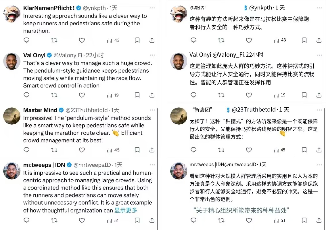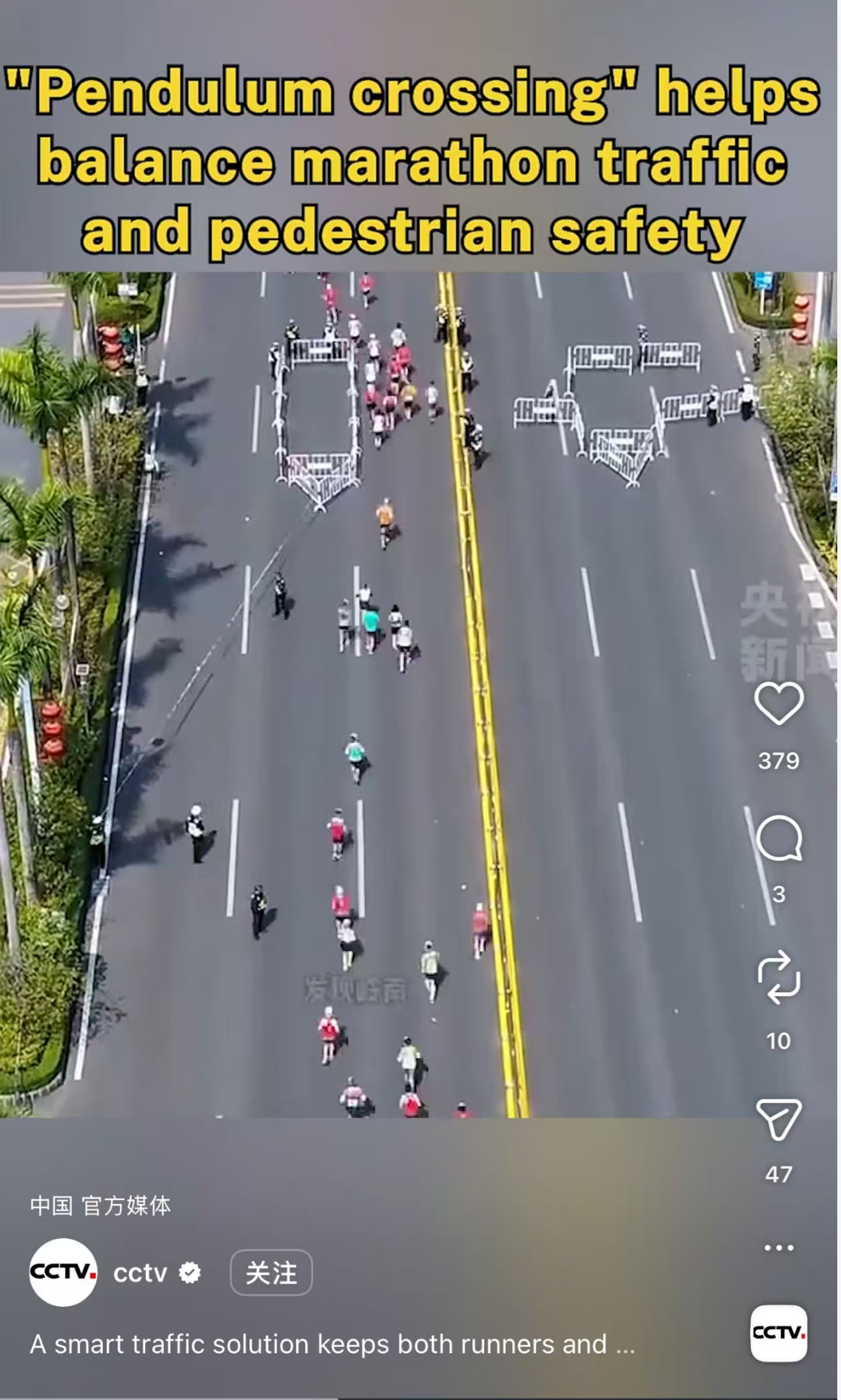 中央电视台也为这个思路点赞“‘钟摆式穿越’有助于平衡马拉松赛事交通和行人安全”。