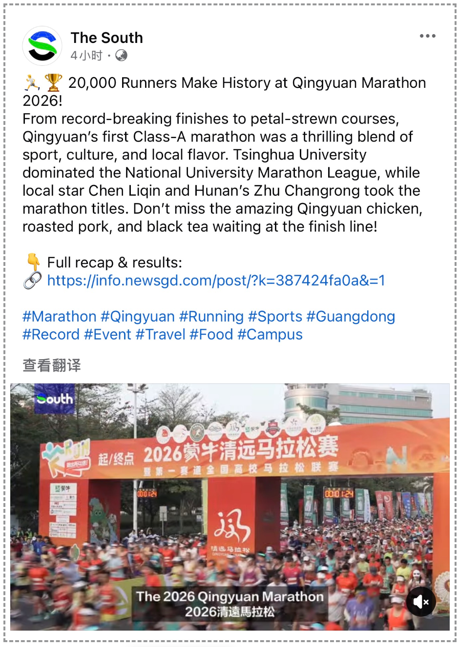 The South更是用《速度、激情与美食:2026清远马拉松点燃全城》为题,把这场赛事的“温度”讲给海外网友听。