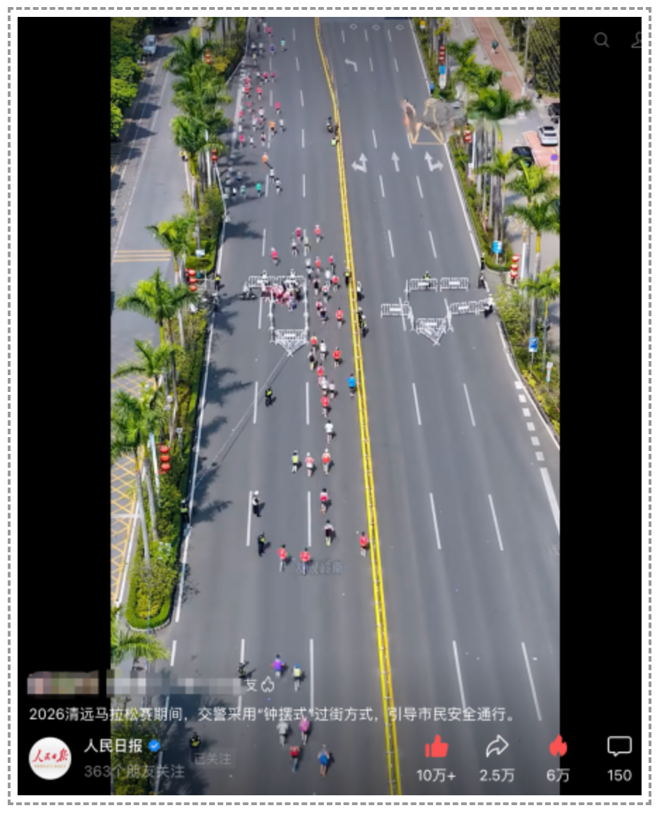 2026年3月15日,当2万多名跑者奔赴北江岸边,清远街头一个小小的通行创新“钟摆式过马路”不仅解决了办赛痛点,还直接火到了海外。