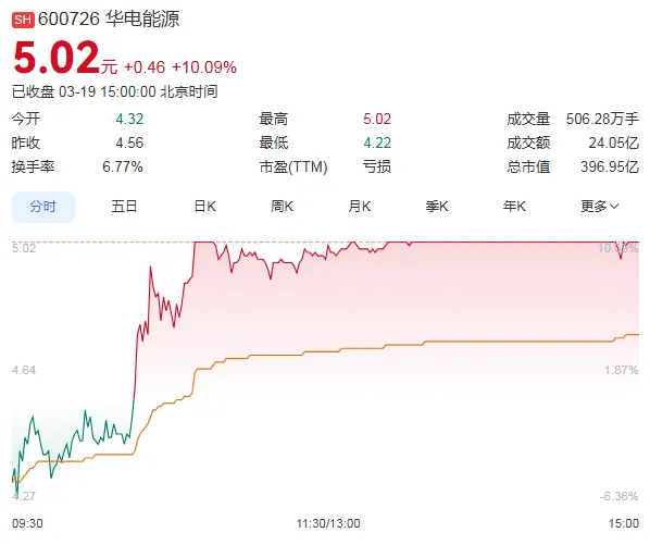 3月19日,华电能源逆势涨停,收盘价为5.02元,成交额为24.05亿元,总市值攀升至3396.95亿元。据统计,自2026年2月24日以来的18个交易日内,华电能源股价累计涨幅超过102%,表现非常亮眼。