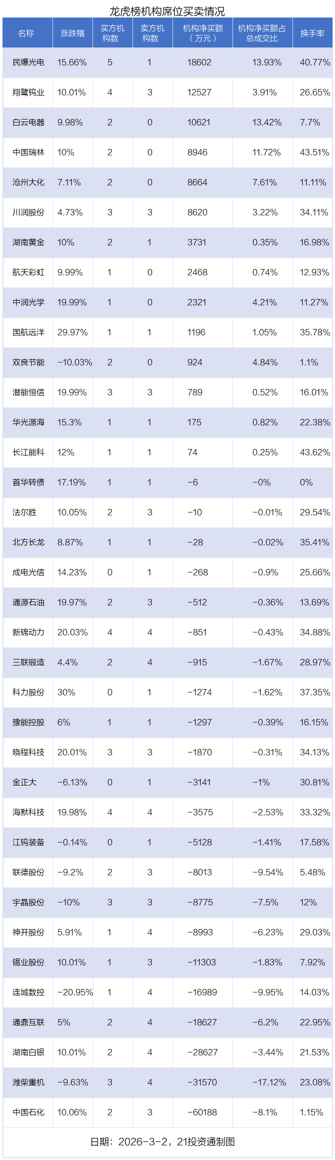 3月2日,36只个股龙虎榜出现了机构的身影,机构合计净卖出13.23亿元。具体来看,机构净买入14股,净卖出22股。