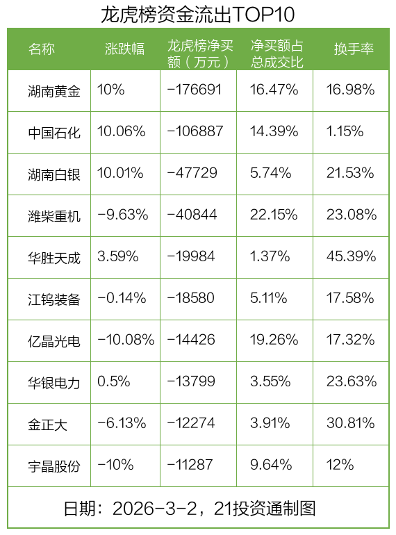 而龙虎榜中资金净流出最多的是湖南黄金(002155.SZ),被净卖出为17.67亿元,占总成交金额的16.47%。湖南黄金收盘上涨10%,换手率为16.98%。