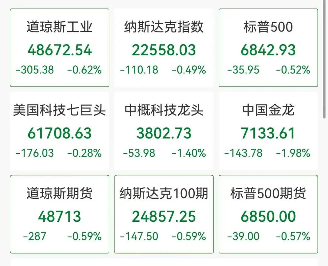 中概股普跌,纳斯达克中国金龙指数跌2.28%,阿特斯太阳能跌超7%,文远知行跌超6%,爱奇艺、美团、小米跌约4%,阿里巴巴、京东、百度等均有不同幅度下跌,比亚迪逆势上涨5%。