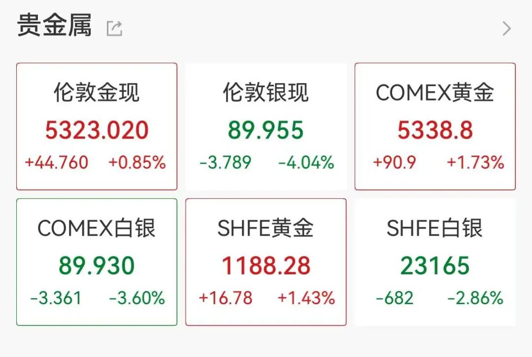 金银短线跳水,现货黄金跌至5323美元/盎司。现货白银一度跌5%,现跌4.04%,报89.9美元/盎司。
