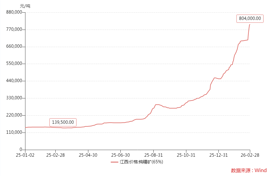 3月2日,65%黑钨精矿价格上涨3万元至83万元/标吨,仲钨酸铵则升至125万元/吨,主要钨产品价格年内涨幅全面突破80%。另有业内人士反馈称,钨废料近两日的实际成交价格也很高。