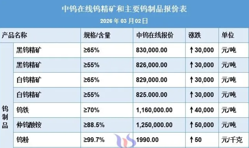 中钨在线数据显示,3月2日,钨精矿、仲钨酸铵、钨粉等主要产品全线上调,其中最上游的黑钨精矿、白钨精矿单日上涨3万元/标吨,最新报价达到83万元/标吨。