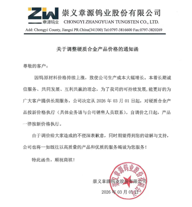 2月26日、3月1日,章源钨业便先后宣布,因钨原材料价格持续上涨,致使公司生产成本大幅增长,决定对其焊接机夹刀片、硬质合金产品价格进行调整。