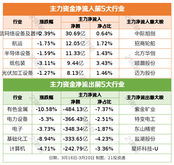 具体来看,截至3月20日收盘,全市场仅11.29%的个股实现上涨,586股收涨,4594股收跌。按照申万二级,通信设备、国有大型银行、乘用车、白酒、航运港口等少数板块逆势上涨,而农化制品、非金属材料、工业金属、冶钢原料、化学原料等周期板块领跌,跌幅均超10%。
