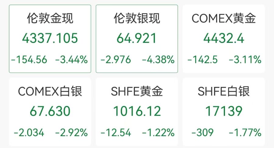 国际贵金属价格持续下挫,现货黄金跌5.56%,报4246.82美元/盎司;现货白银跌8.13%,报62.35美元/盎司。