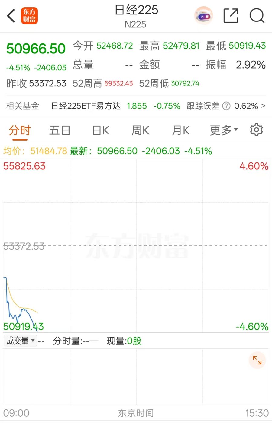 日经225指数向下跌破51000点,日内下跌4.5%