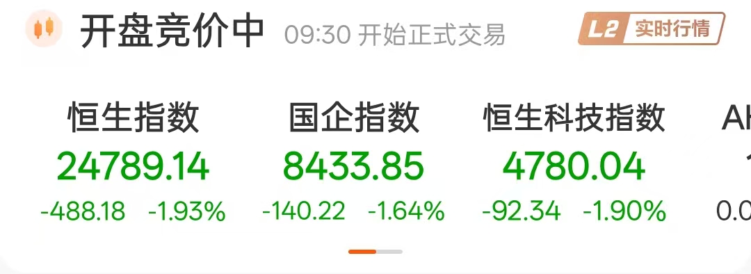 香港恒生指数开盘跌1.93%,恒生科技指数跌1.9%。赤峰黄金(06693.HK)跌18.96%、灵宝黄金(03330.HK)跌7.50%、山东黄金(01787.HK)跌4.54%、招金矿业(01818.HK)跌4.38%。消息方面,国际金价持续走低,早盘一度跌超4400美元,目前处于4419美元。