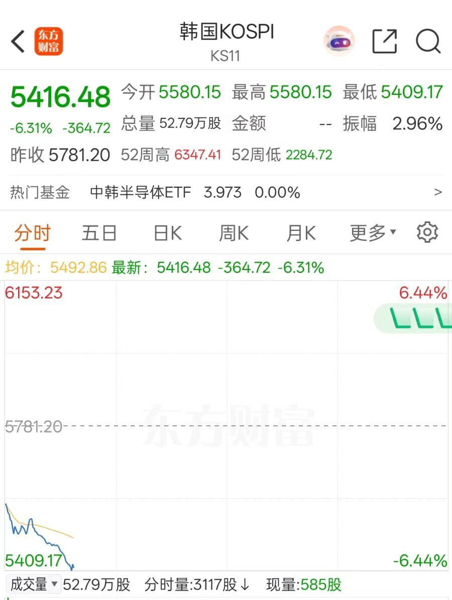 韩国KOSPI指数日内重挫6%,报5416.48点。
